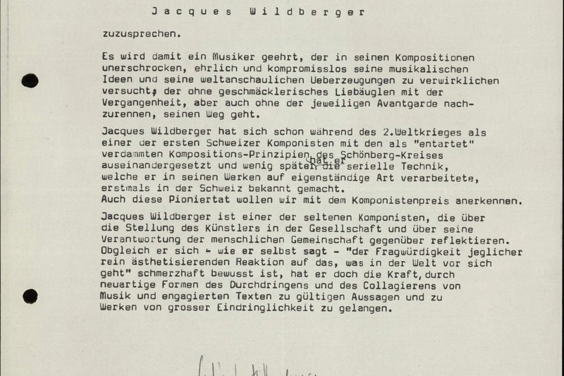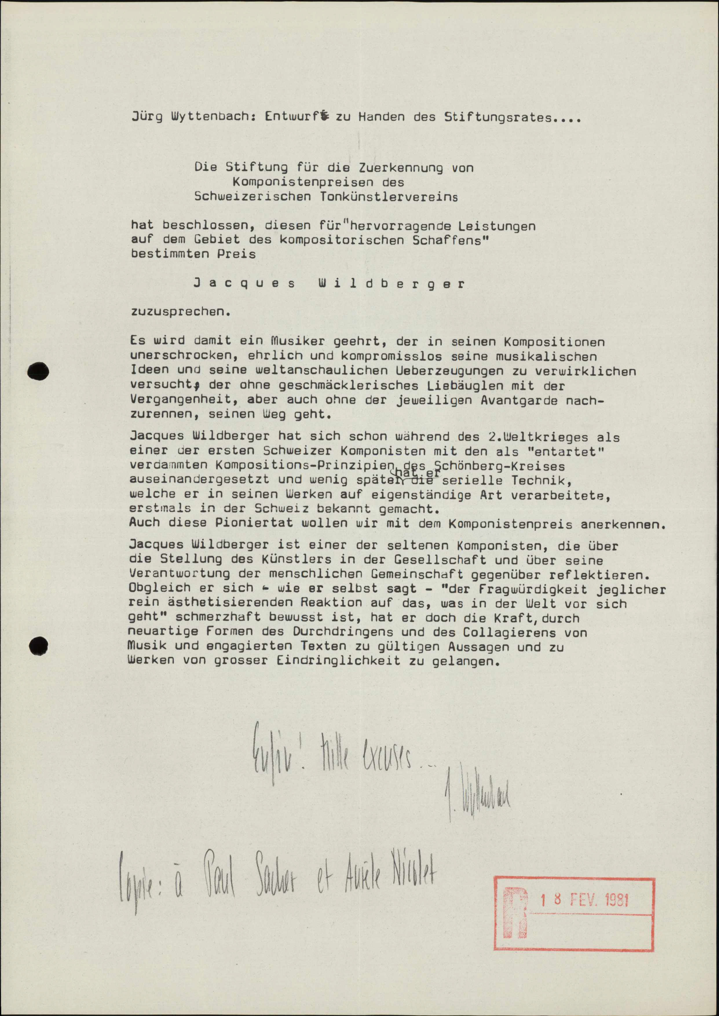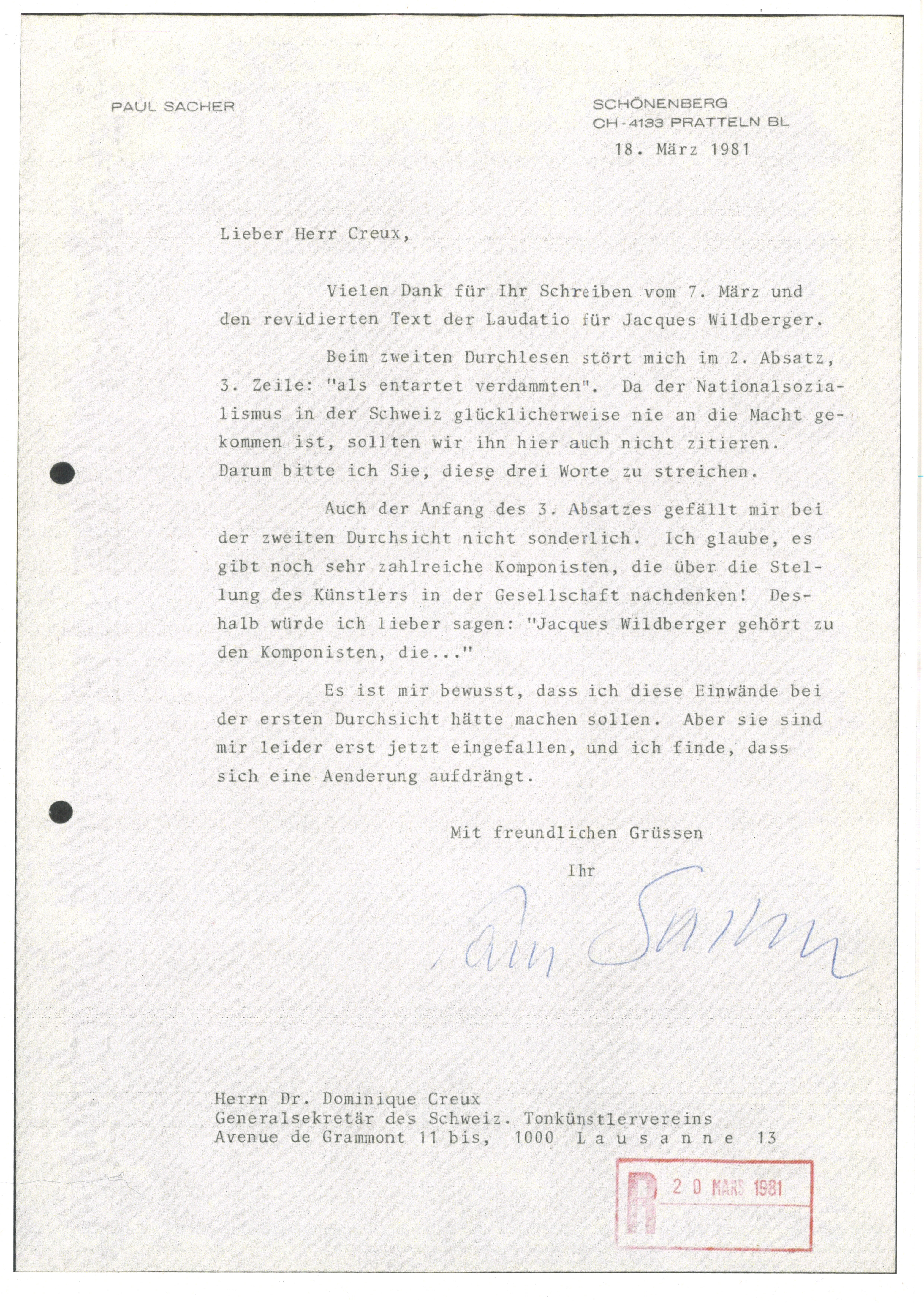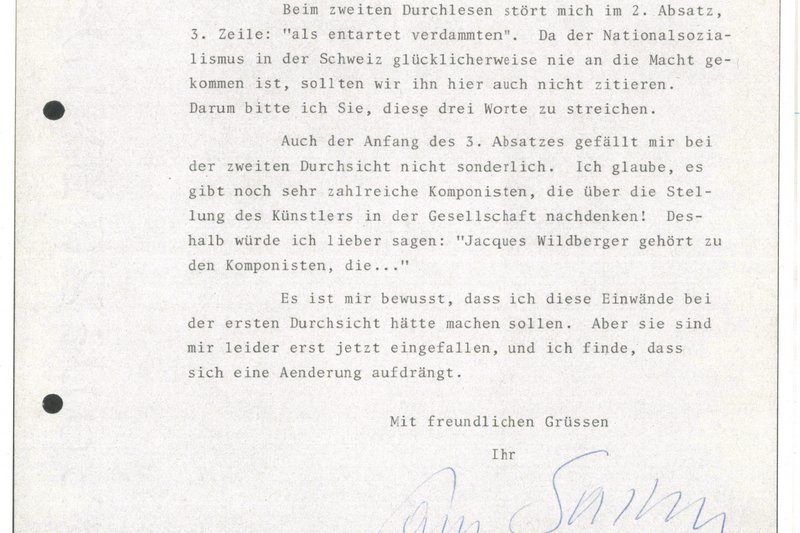 Das zeigt sich schön bei Komponisten, die mit dem Lucerne Festival verbunden waren: Jürg Wyttenbachs Laudatio auf Jacques Wildberger stiess bei Jurypräsident Paul Sacher wegen ihres ungewohnt politischen Tons auf (vgl. Abbildung unten und Kommentar)