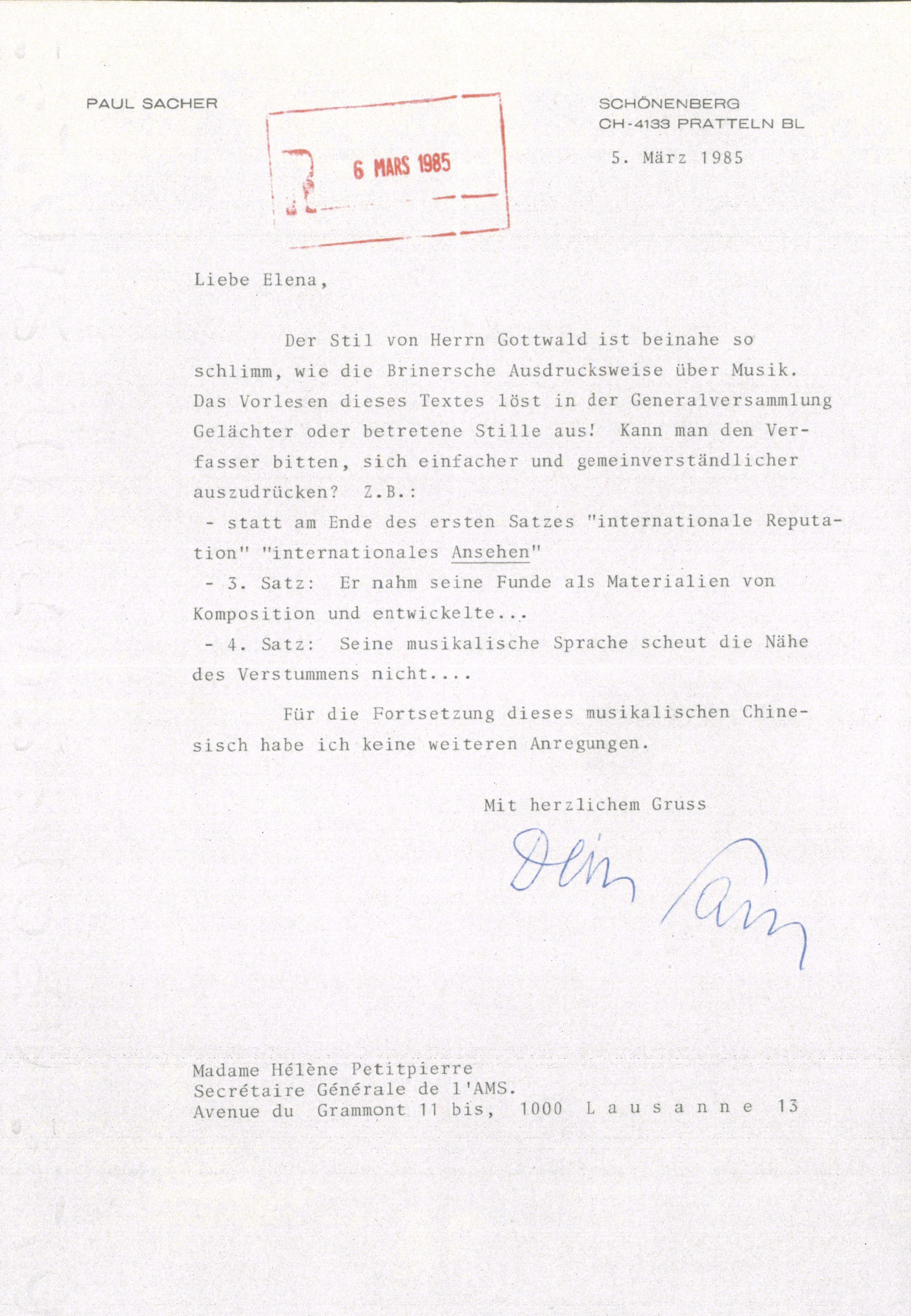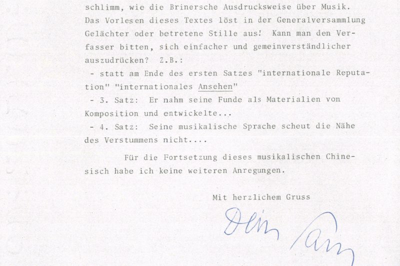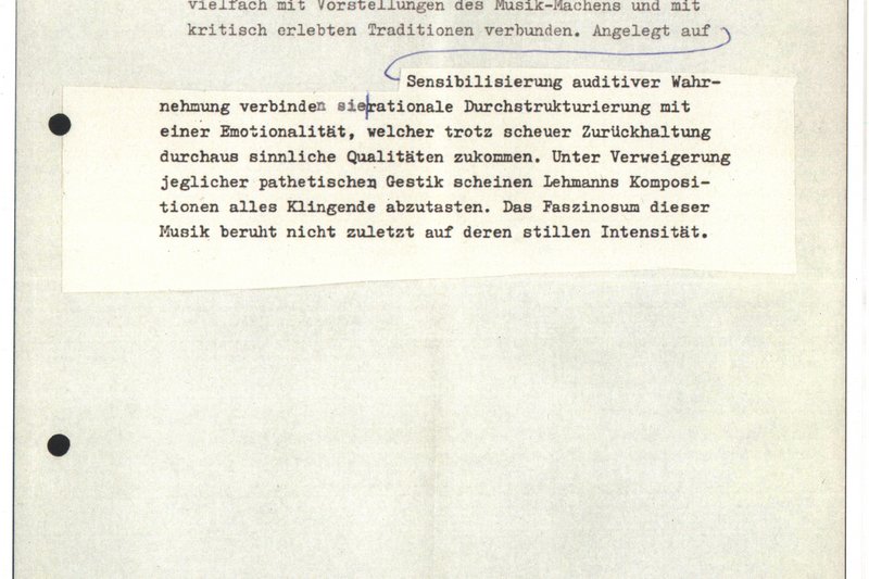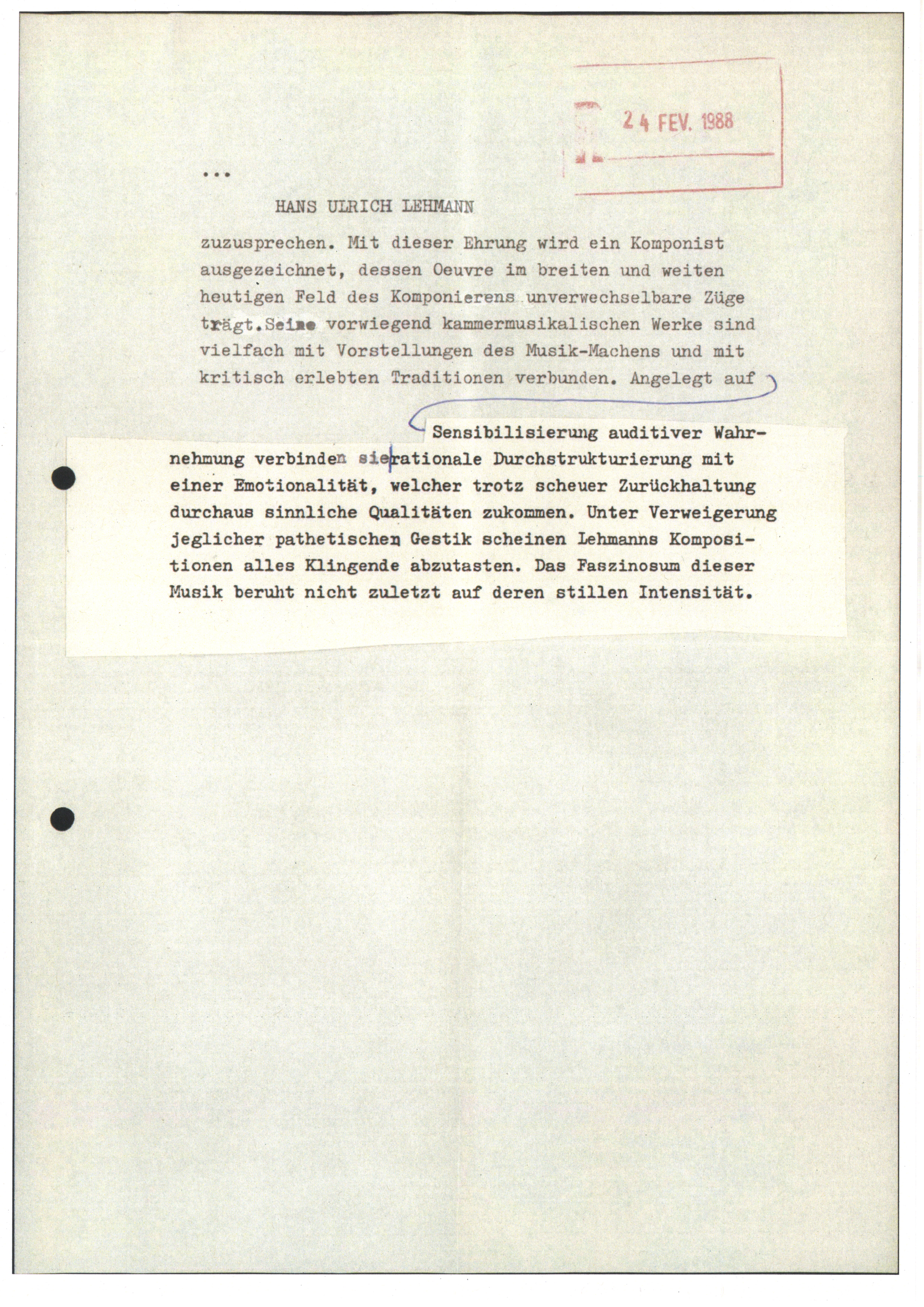 Für Hans-Ulrich Lehmann verfasste der Musikwissenschaftler Kurt von Fischer eine sehr persönliche Würdigung, die Lehmanns «unverwechselbare Züge» in einige sehr treffende Paradoxien kleidet, wie die «kritisch erlebten Traditionen», die «rationale Durchstrukturierung», die er der «stillen Intensität» und einer «Emotionalität» unter «Verweigerung jeglicher pathetischen Gestik» gegenüberstellt. Wieder protestiert Sacher, man müsste dies doch einfacher und verständlicher formulieren, worauf von Fischer einfach mit Schere, Klebstoff und Tippex seinen Text umstellte (vgl. Abbildung).