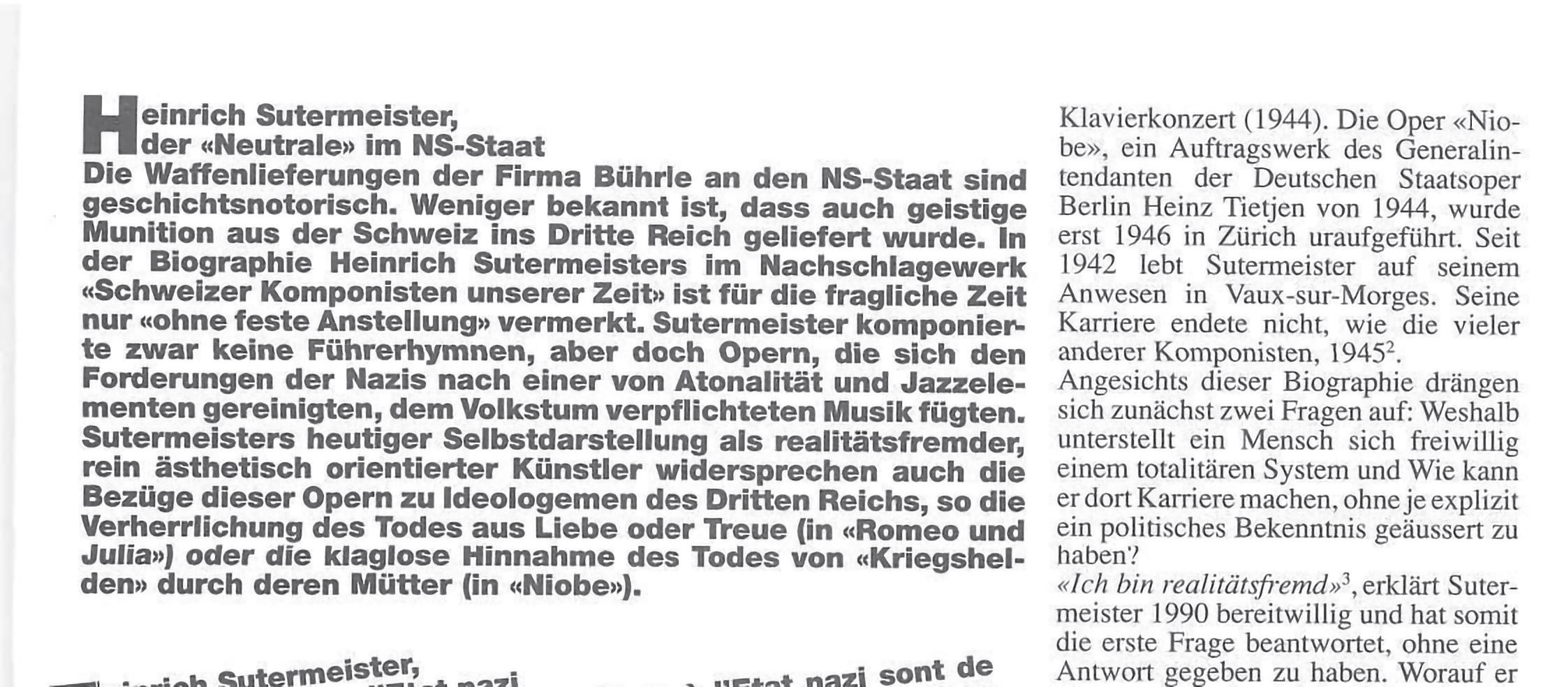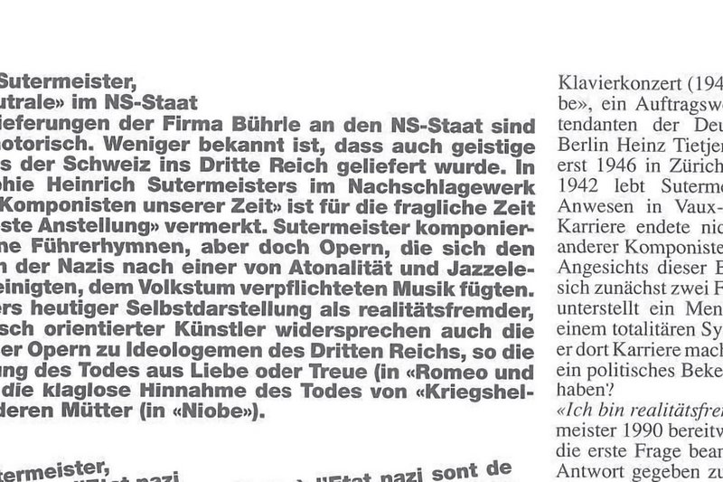 Gerne lässt Keller auch auf hohe Funktionäre und breit anerkannte Persönlichkeiten eindreschen. So wird Heinrich Sutermeister, der international erfolgreiche Opernkomponist und Präsident der Urheberrechtsgesellschaft, wegen seiner Verstrickung in Aufführungen im Dritten Reich problematisiert. Dieser Angriff erfolgt just am Vorabend des 80. Geburtstages, als gerade eine Delegation des STV zu ihm pilgert.