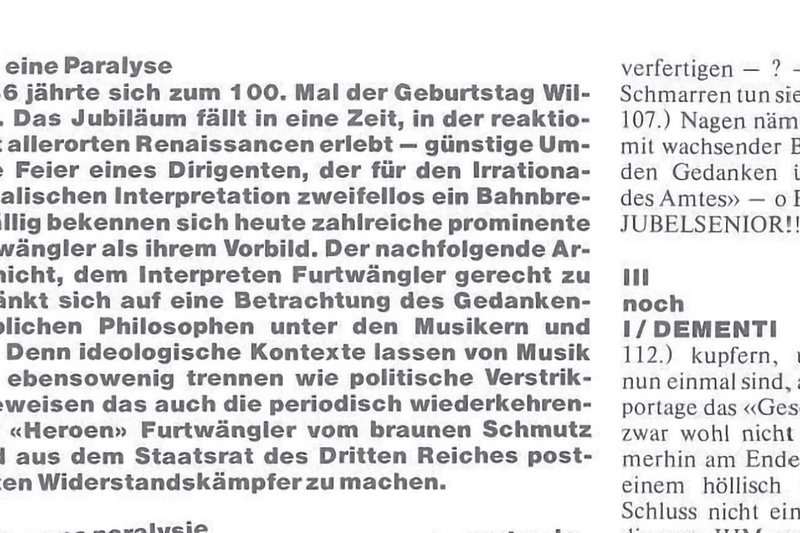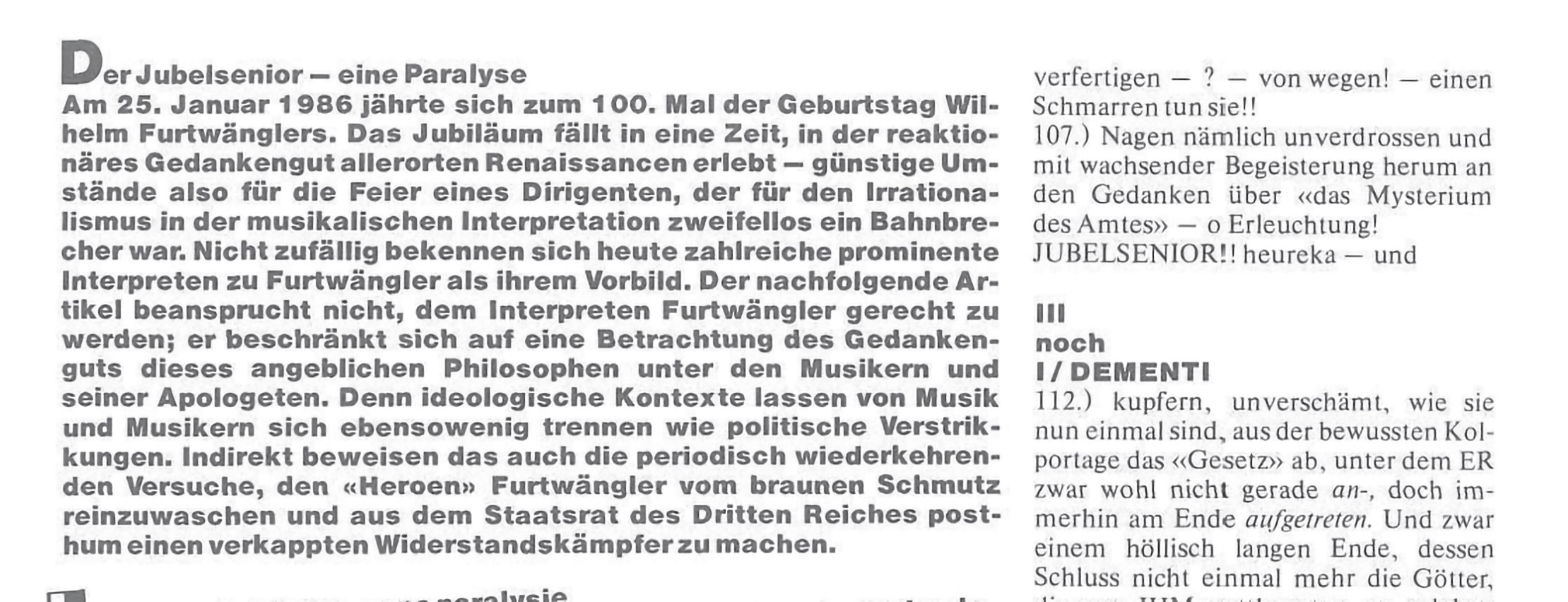 Anstoss erregt nicht zuletzt ein Artikel zum 100. Geburtstag von Wilhelm Furtwängler: In «Der Jubelsenior – eine Paralyse» nimmt Erika Deiss eine scharfe Sprachkritik – oder besser Verspottung – von Furtwänglers Schrift Vermächtnis vor, in der sie dem «Seelenwilli» das Phänomen der «simultanen Selbst- und reziproken Fremdverspinnung in ein allseits anerkanntes Tiefsinnsmonster» sowie Deutschtümelei vorwirft.