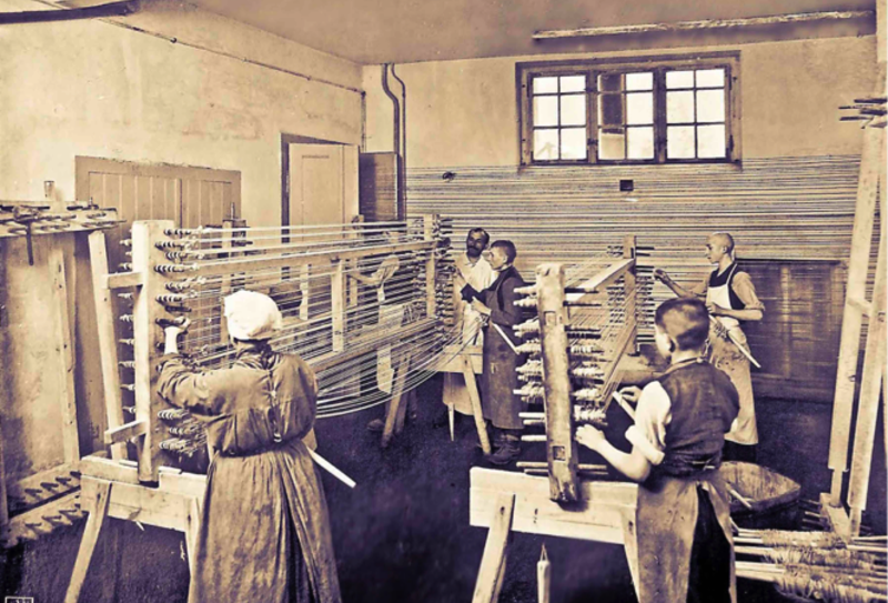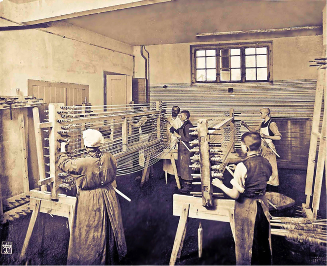 Bild: Aufhängen der gedrehten Saiten auf Spannrahmen (Markneukirchen ca. 1918, Archiv Dr. W. Geipel, Markneukirchen)
