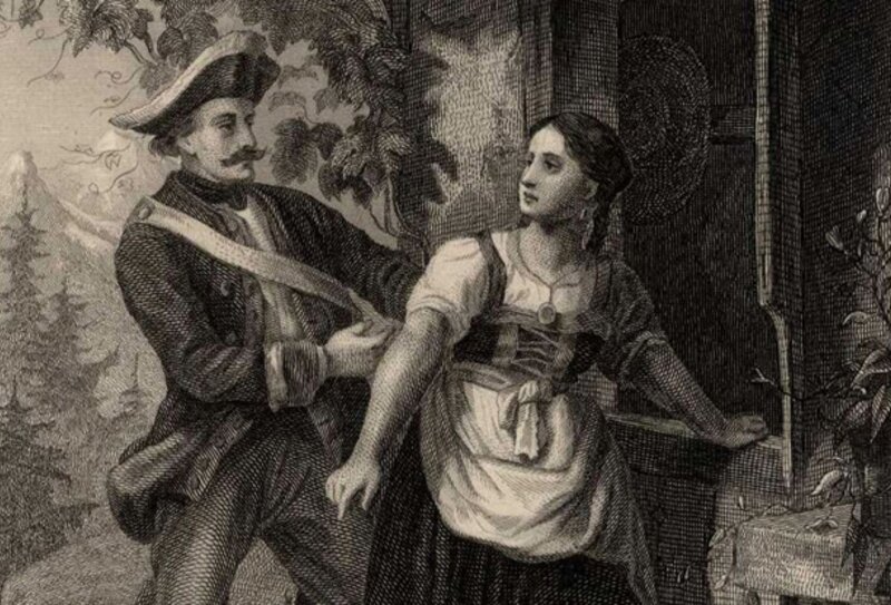 Bild: Stahlstich von E. Dertinger zu Goethes Singspiel Jery und Bätely (um 1880).