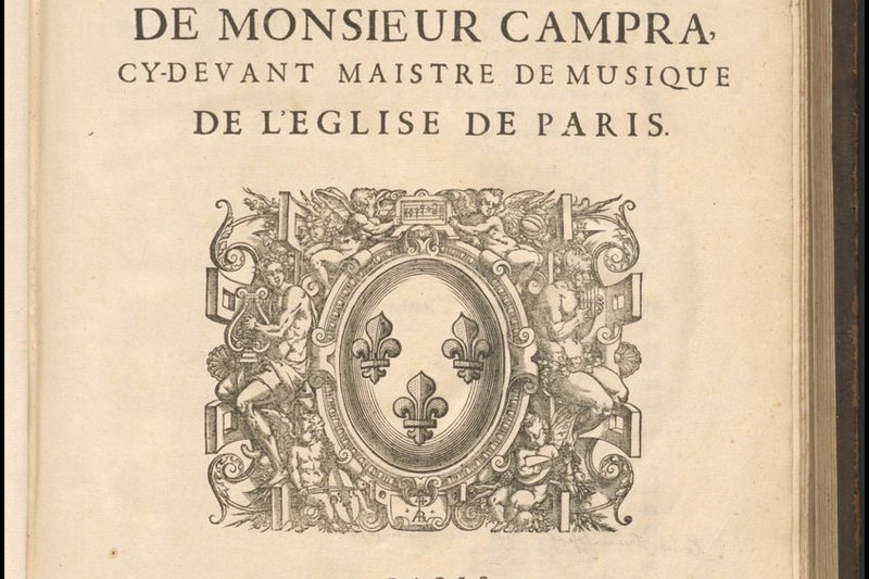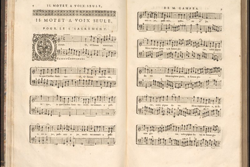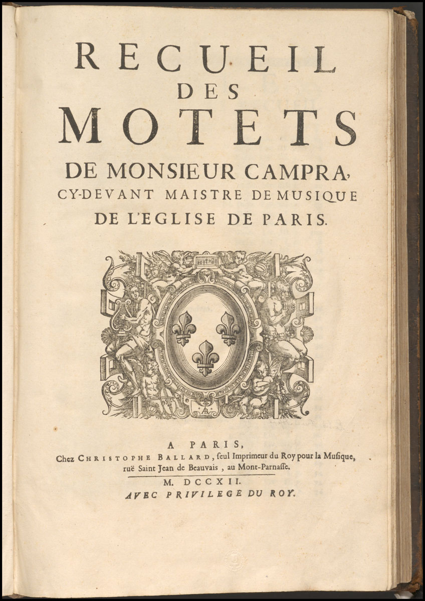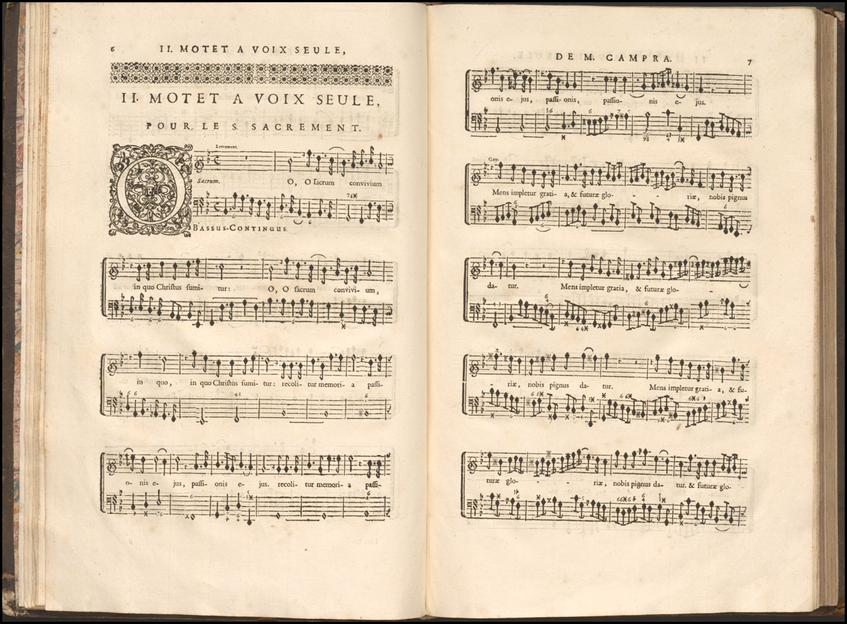 André Campra, Recueil des motets, 1712 (ZHB Luzern, M.b 821, Titelblatt und S. 6-7)