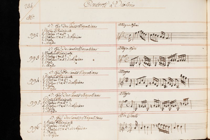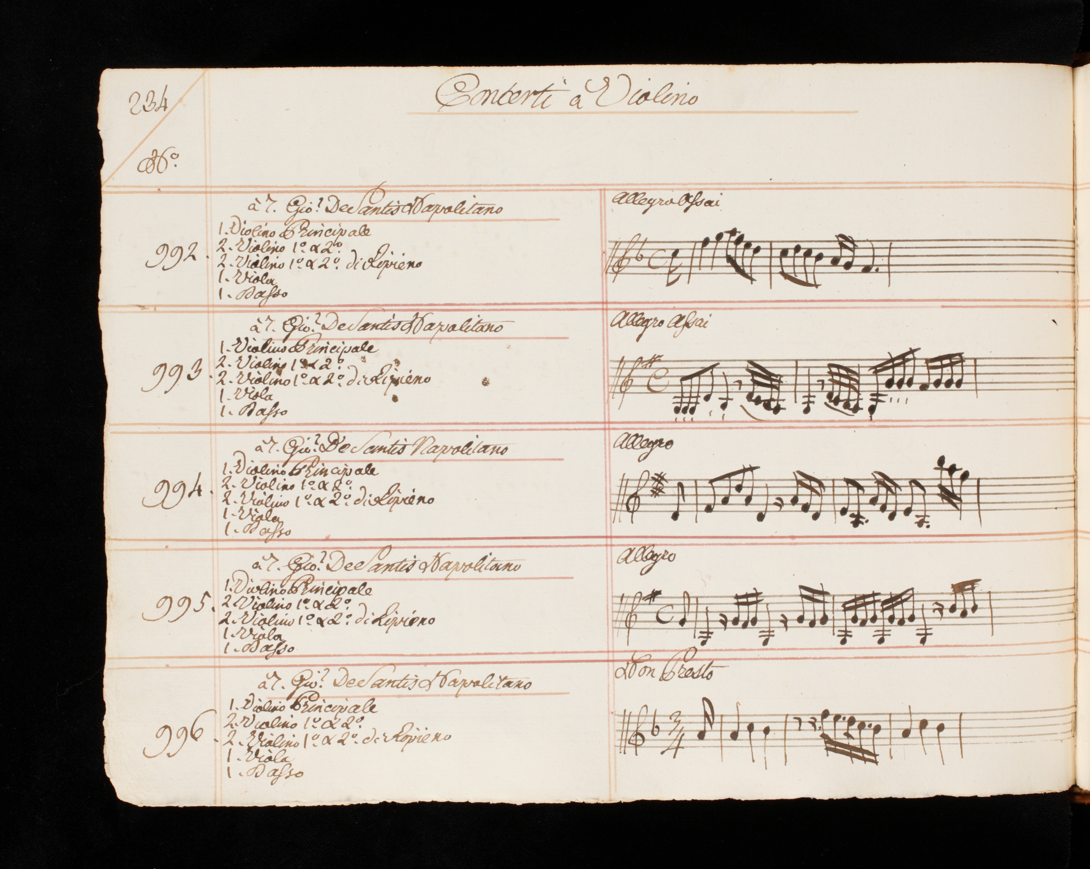 Verzeichnete Violinkonzerte von Giovanni De Santis, 1732, in: Katalog der Lucas Sarasin'schen Musiksammlung (UB Basel, HKun d III 9, S. 234)