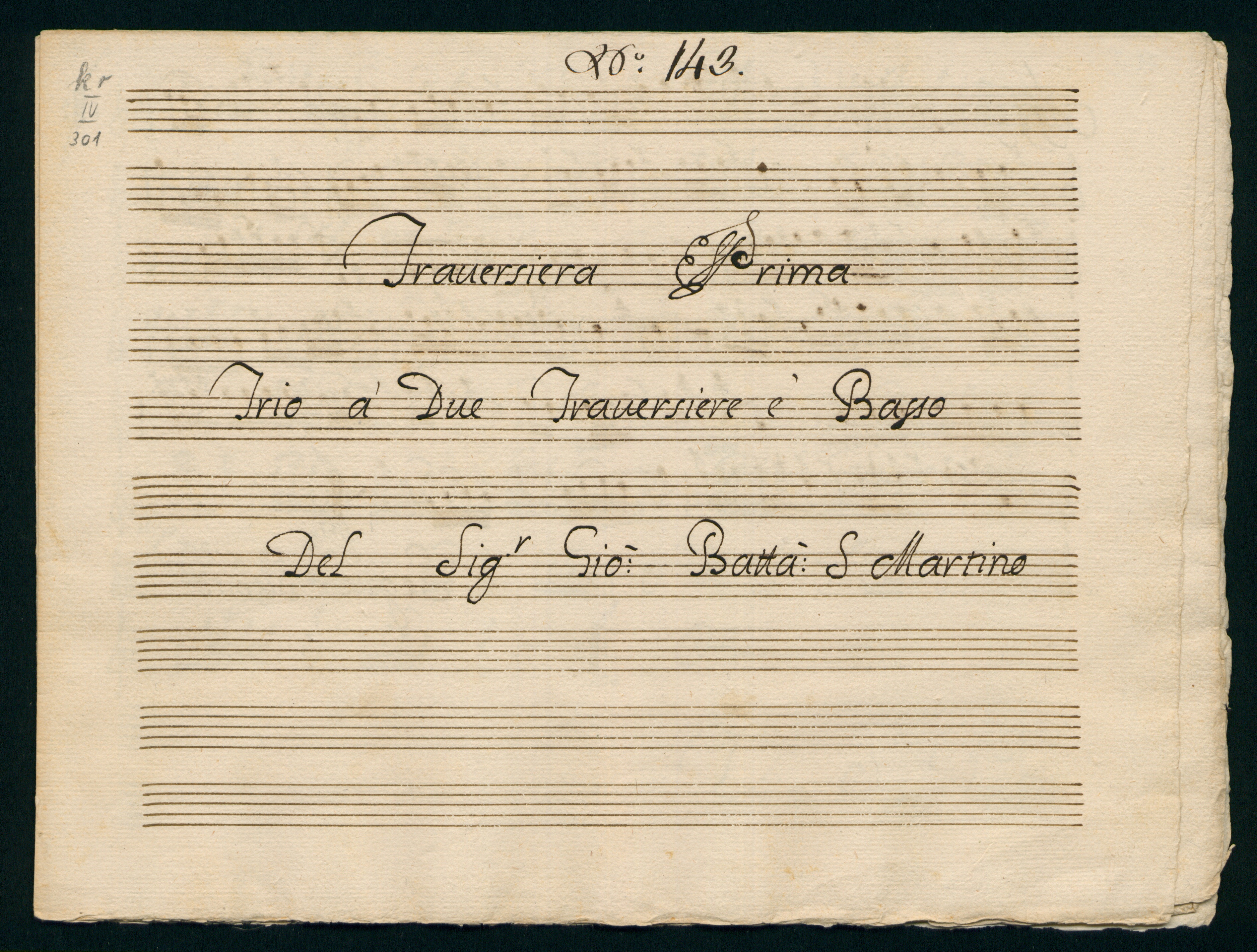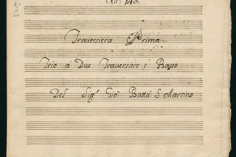 Obwohl seine Musik teilweise die Wiener Klassik vorwegnimmt, schrieb der Mailänder Komponist Giovanni Battista Sammartini Triosonaten in der barocken Tradition für zwei Querflöten oder zwei Violinen und Bass. Zum Teil wurden Violintrios auch für Flöten umgeschrieben. Die drei Stimmhefte stammen aus einer Mailänder Kopistenwerkstatt.