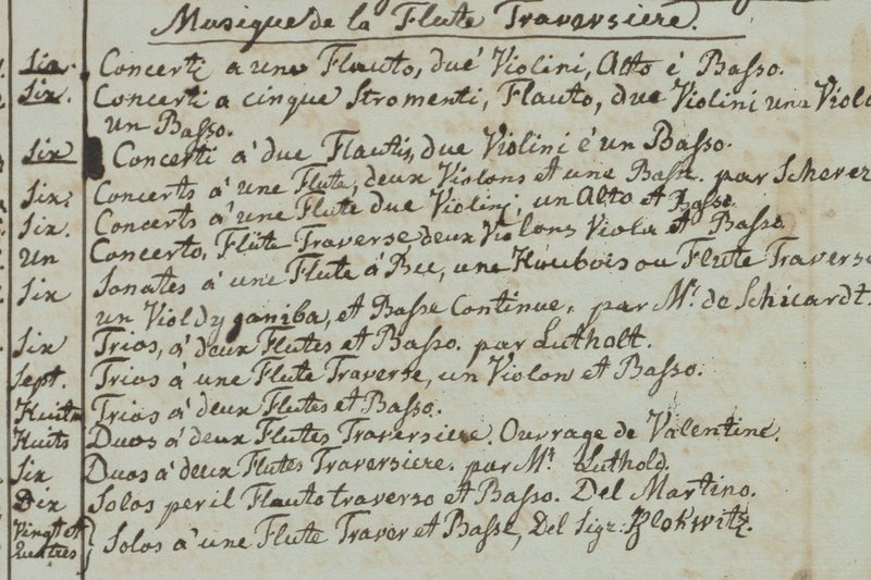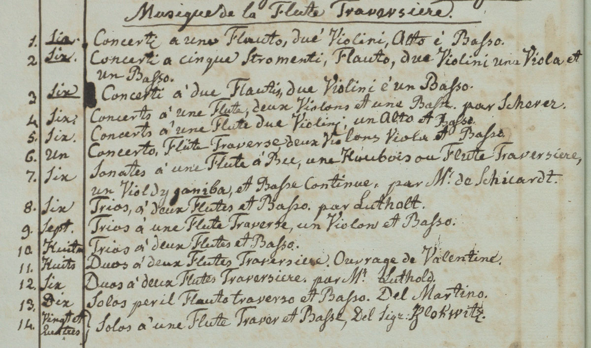 In seiner Bibliothek besass von Steiger mehrere Werke für die «Flute Traversière». Zu den Autoren zählen unter anderem Johann Christian Schickhardt (ca. 1682–1762), Johann Martin Blockwitz (1687–1742) sowie «Martino», hinter dem sich Giovanni Battista Sammartini (ca. 1700–1775) verbirgt.