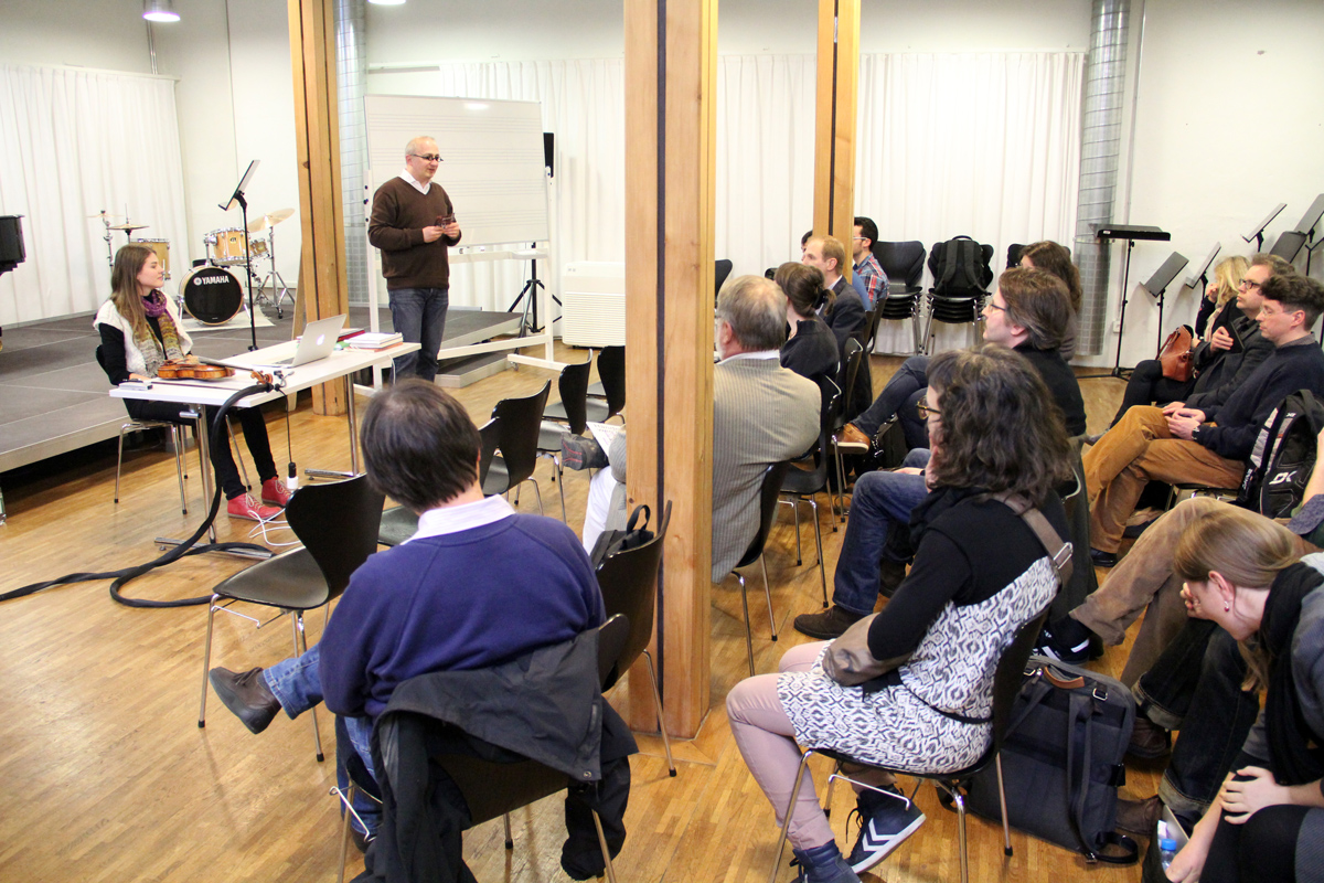 Kombinationstöne, also Töne, die bei auf Streichinstrumenten gespielten Zweiklängen zusätzlich noch erklingen, standen im Zentrum des Forschungs-Mittwochs am 25. März 2015. Nähere Informationen finden sich direkt auf der Veranstaltungsseite, einige Impressionen gleich hier.